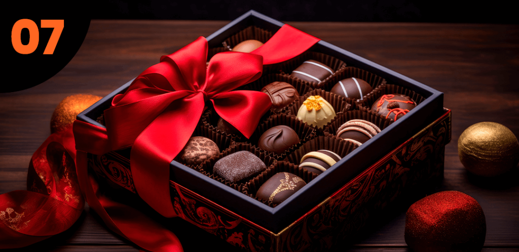 - Exemplos: Cestas com chocolates variados, bombons, vinhos, biscoitos, frutas secas.